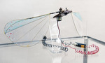 Houten plaatje met afdruk van Meganeudonvleugel, met vastgeniette zwart-wit foto