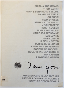 I am you : Kunstenaars tegen geweld/Artistes contre la violence/Künstler gegen Gewalt, 1993. Book, ink, paper, 29.5 x 21 cm, 15 p., language : Dutch, French, German, publisher : Goethe-Institut Brussel and Museum van Hedendaagse Kunst Antwerpen.
