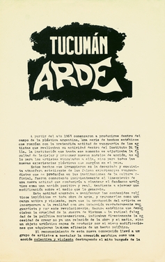In this manifest for the action 'Tucumán Arde' (‘Tucumán Burning’, 1968) the group states: ‘The collective work done is based on the present situation in Argentina, which becomes more radical in one of its poorest provinces, Tucumán, which has been subjected to a long tradition of underdevelopment and economic oppression.’