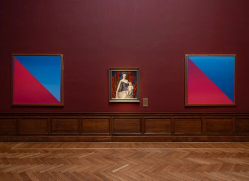 Pour Jef Verheyen, la peinture est comme une « liturgie ». Une célébration de la couleur. Il s’intéresse à la symbolique des couleurs, aux émotions qu’elles suscitent et à l’interaction entre couleur et signification. Une reproduction de la Vierge de Jean Fouquet se trouvait sur le mur de son atelierOn peut voir ici côte à côte le diptyque de Jef Verheyen intitulé Lux est Lex et le chef-d’œuvre du 15e siècle, qui faisait lui aussi initialement partie d’un diptyque. Les deux artistes jouent avec le contraste entre le bleu et le rouge, le chaud et le froid. Les chérubins et les séraphins deviennent des aplats de couleur. Le diptyque de Verheyen est un hommage à un tableau qui, par sa modernité, semble surréel. Il aurait tout aussi bien pu être peint aujourd’hui.